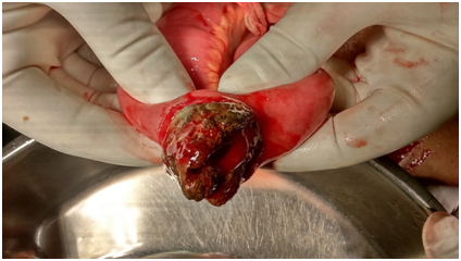 Exploratory laparotomy revealed obstruction in the terminal ileum (intraluminal) around 10centimetres proximal to the ileo-caecal junction. Beyond this site the intestinal loops were normal in calibre. On thorough examination of the guta concomitant gastric intraluminal mass was also palpable. Longitudinal enterotomy was performed at a site proximal to the obstruction and an ovoid shaped phytobezoar of size of 6x4cm was removed (Figure 2). Longitudinal gastrotomy was done at the level of gastric body and a similar looking phytobezoar as removed from the stomach (Figure 3). The enterotomy and gastrostomy site were closed primarily with interrupted sutures. Both the phytobezoars were smooth, ovoid and firm in consistency. The patient recovered well in the post operative period without any complication. A subsequent enquiry of the patient’s nutritional habits was done which revealed ingestion of mango seeds (MangiferaIndica) multiple times along with the fruit. After appropriate psychological counselling, the patient was discharged on seventh post-operative day uneventfully.