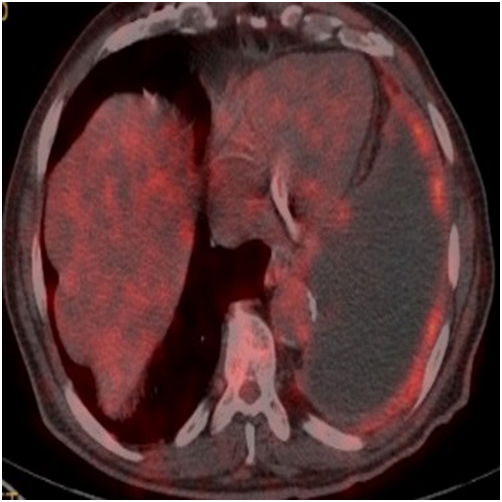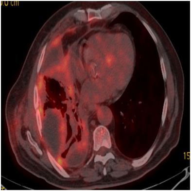 Figure 4 FDG (SUV max 6-7.6) uptakes in diffuse pleural thickening areas evident in the right hemithorax upper and middle zone.