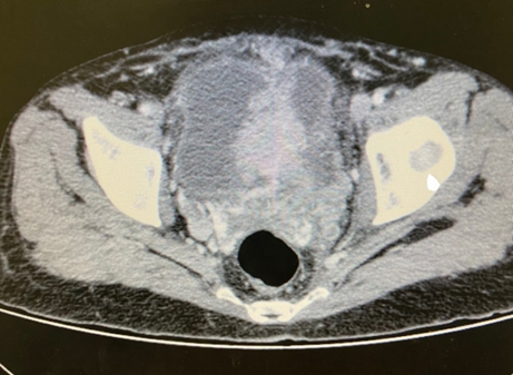 In June 2020, a 52-year-old woman presented with complaints of frank hematuria, dysuria, and intermittent episodes of acute urinary retention. She also reported hyporexia, adynamia, weight loss, and severe pain in the hypogastrium and lower limbs.