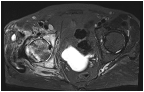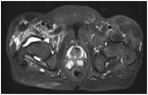 Radiographic study with MRI of the right hip without contrast showed right hip moderate-sized effusion with diffusely scattered soft tissue/intramuscular fluid and edema extending along the right iliac wing with diffuse marrow edema involving the right pelvis, right femoral head/neck region compatible with osteomyelitis and septic arthritis. (Figure 1).