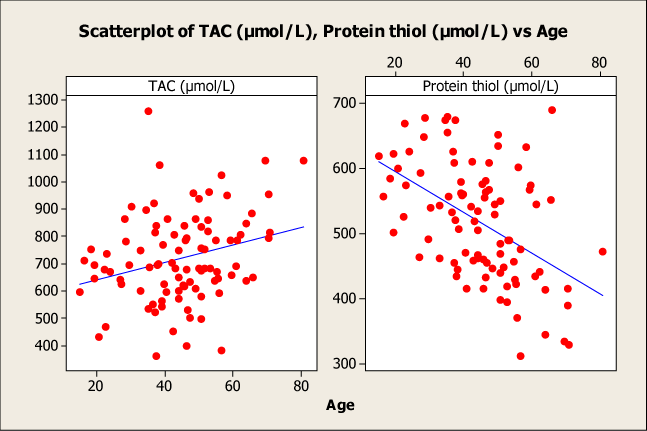 This study showed a significant negative correlation between TAC and protein thiol concentrations of females. The probability plot of TAC in females indicated a normal distribution. TAC is an estimate of the reducing ability of serum and not only protein thiol the other substances found in serum could also contribute to the reducing ability. In males no significant correlation between TAC and protein thiol concentration could be observed may be due to smaller numbers involved in the study. In the study done by Jansen and Ruskovska (2013), total thiols of males have shown a negative but non significant correlation with the TAC (r=−0.008).