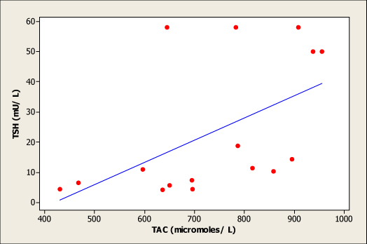 The significant positive correlation between TSH and TAC (r=0.526, P=0.036) in hypothyroid patients in the present study hitherto has not been reported. Serum TSH in hypothyroid patients is a measure of the extent of under activity of the thyroid gland and a higher TSH concentration means an overt hypothyroidism. Therefore it could be expected that the TAC concentration to relate positively with TSH concentration.