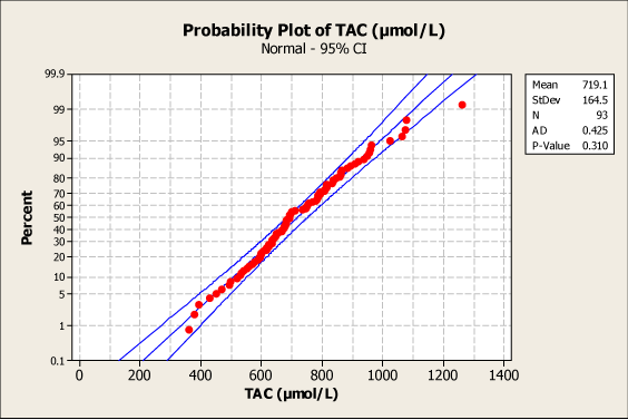 In the study population, based on serum TSH concentration, 9 patients (9.7%) were hyperthyroid, 68 (73.1%) were euthyroid while 16(17.2%) were hypothyroid. There was a significant positive correlation between TSH and TAC (r=0.526, P=0.036) in hypothyroid patients (Figures 2). No such correlation was observed in hyperthyroids or euthyroids. There were no significant differences in TAC or protein concentrations between the groups (Table 2). The probability plot for TAC in hypothyroid patients indicated a normal distribution (p=0.31) (Figure 3).