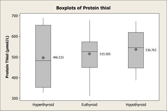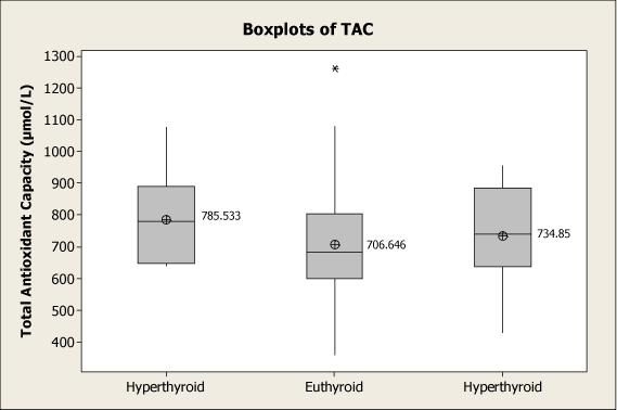 Table 2 Mean values for Age, TSH, TAC and Protein thiol. Superscripts in columns with same letter are not significantly different the distribution of TAC and protein thiol in hypothyroid, euthyroid and hyperthyroid patients are presented in Figures 4, Figure5. The range and SD values for TAC and protein thiol indicated a wide variation whereby mean comparison did not reveal any significant differences among the groups