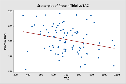 Table 3 Mean Age, TSH, TAC and Protein thiol according to gender. Superscripts in rows with same letter are not significantly different Mean serum TAC and protein thiol concentration of females had a significant negative correlation (r=-0.263, P=0.015) (Figure 4). The probability plot of TAC in females indicated a normal distribution (p=0.503). In contrast, no significant correlation was observed between TAC and protein thiol levels of men (r=0487, P=0.221). This could be attributed to the smaller number of males in the study