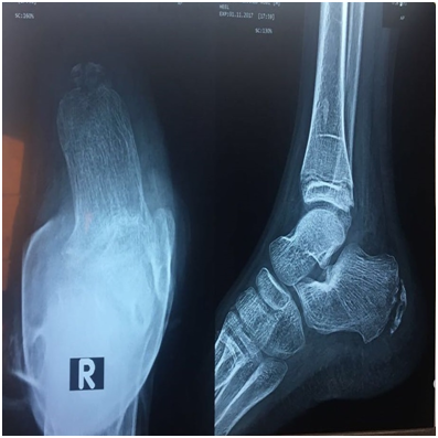 The ultrasonography demonstrated fragmentation of the apophysis of the calcaneus and an avulsed bone fragment at the insertion of the Achilles tendon (Figure 3) together a well-defined echogenic fluid collection with high Doppler signals on both sides of tendo-achilles (Figure 4). Ultrasonographic guided needle aspiration of the fluid collection was performed, the Culture of the aspirated fluid revealed Staphylococcus aureus. The X-ray showed Fragmentation of calcaneal apophysis & few osteolytic lesions (Figure 5). Echocardiography was normal. Further evacuation was done surgically and antibiotic was started with marked improvement of the patient condition.