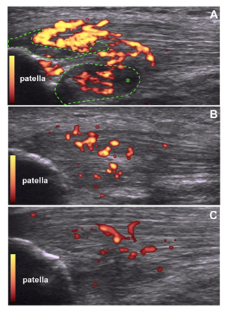 A 35-old year healthy Caucasian football player man presented with a 3years history of anterior knee pain and tenderness in his right patellar tendon insertion. He referred a constant dull aching pain with walking, forcing to discontinue sport because of the severity of his pain. He has been previously treated with conservative therapy and with platelet-rich plasma (PRP) injections; however his pain did not improve. At presentation, pain was rated as 7 out of 10 on Visual Analogue Scale (VAS). Color Doppler ultrasound examination revealed signs of tendinosis with significant neovascularity, formed by immature tortuous and dilated vessels into intratendinous mass (Figure 1A). Furthermore, color Doppler scans showed areas of intratendinousedema in the proximal patellar-tendon interface (Figure 1A). After discussing the various treatment options, the patient opted to try etamsylate injection and signed an informed consent. Lidocaine was infiltrated into the skin overlying the right patellar tendon. 4ml etamsylate (Dicynone®, Sanofi-Aventis. France) were injected under ultrasound guidance into peritendinous patellar tendon tissue. The procedure was uneventful. At 2weeks follow-up visit, patient reported a marked improvement of his pain (VAS was rated as 2), and color Doppler ultrasound scans showed a significant reduction of neovessels and disappearance of tendinous edema (Figure 1B). Furthermore, at 4weeks tendon hypervascularity decreased (Figure 1C) and pain strongly ameliorated (VAS=1). Patient could return to his previous level of sport without any restrictions.