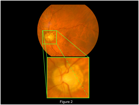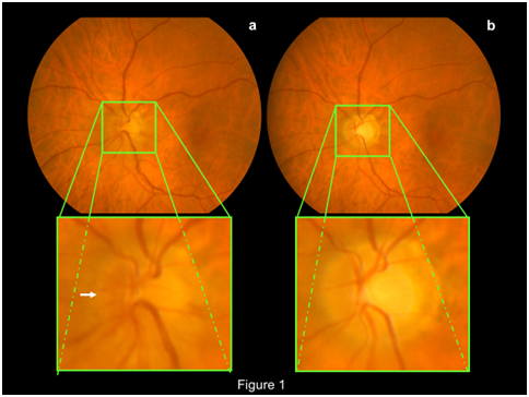 A 63 years-old male presented with complete loss of light perception in his right eye due to a 12 years history of optic neuritis. He had no history of neurologic and systemic diseases. At presentation, he referred a 5 days history of sudden vision loss in his left eye. His best-corrected visual acuity (BCVA) of the left eye was 0,05 and he could count fingers at 50 cm distance with corrected light projection with the left eye. Fundus examination revealed that the patient suffered optic neuritis at his left eye: an apparent papillitis with a practically absent optic cup of indistinct margins, and a haemorrhage in the temporal portion. Venous congestion was also evident (Figure 1A). The slit-lamp exam of the anterior segment was normal. After discussing with the patient, the benefits and risks of possible treatments, he chose intravitreal dobesilate administration. Informed consent was obtained. The study was approved by the Institution review board and it followed the principles outlined in the Declaration of Helsinki. The patient received an intravitreal solution of dobesilate (150 μL) in his left eye. Dobesilate was administered as a 12.5% solution of diethylamonium 2,5-dihydroxybenzenesulfonate (etamsylate, Dicynone® Sanofi-Aventis, Paris, France) in the operating room under complete aseptic conditions with topical anaesthesia. Topical ciprofloxacin was given 4 times a day for 5 days postoperatively. After treatment, patient was examined at day 1, and at weeks 2 and 4. At day 1, injected eye underwent an ophthalmic examination for discarding anterior chamber reaction and intraocular pressure rise. Over time the condition improved (Figure 1B). Fundoscopy after 1 month of treatment revealed that papillitis and haemorrhage have resolved (Figure 2). Furthermore, BCVA notably improved from baseline (treatment start) to 0,6 at 1 month follow-up visit. Colour vision also improved. No recurrent episodes of optic neuritis were reported at 3 months follow-up visit, and no adverse effects were referred.