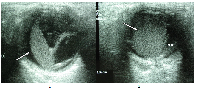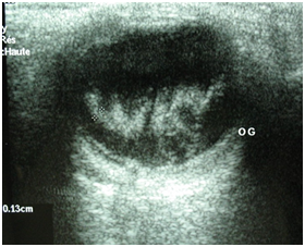 A 38-year-old patient, with no notable pathological history, presented for a progressive decrease in visual acuity of the right eye that had been evolving for two weeks and had been brutally aggravated in the last two days. Ophthalmological examination with fundus showed serous and extensive detachment of the right retina with sub-retinal infiltrates on both sides. B-mode oculo-orbital ultrasonography with a high-frequency probe showed the presence of well-defined echogenic formations of homogeneous choroidal and bilateral tissue echo- structure (Figure 1-3) suggestive of metastases. The exploration was completed by oculo-orbital magnetic resonance imaging confirming the same findings. The search for the primitive objectified a left breast carcinoma. She had a hard, irregular nodule two centimeters from the supero-outer quadrant of the left breast. Echo-mammography showed stellar nodular opacity at the left supero-external quadrant measuring two centimeters and containing micro-calcifications. This opacity was rated ACR 4 (American College of Radiology) and highly suspect. The CA15-3 level was elevated to 85 IU / ml (normal <35 IU/ml) and the nodule cyto-puncture found infiltrating ductal adenocarcinoma with trabecular carcinomatous cells, pleomorphic nuclei, marked atypia, and many mitoses; grade III SBR (histo-prognosis grade of Scarff Bloom and Richardson). There were no associated axillary lymphadenopathies, neither homo nor contralateral. Extension assessment for other metastases was negative (abdominal ultrasound, standard chest X-ray, thoraco abdominal CT scan, brain MRI and bone scintigraphy). The patient was given immediate radiotherapy for secondary ocular lesions given the visual risk. After four courses of radiotherapy, the evolution was unfavorable with worsening of the visual deficit and persistence of choroidal metastases unchanged on the control ultrasound done a month later. Surgery for breast cancer was refused by the patient.