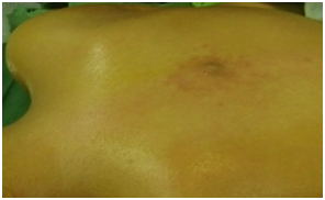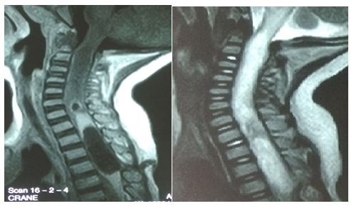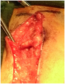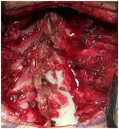 It is a 15-month-old infant of Mauritanian nationality, with a history of unprotected neonatal infection, received in our neurological clinic for motor deficiency of the two lower limbs. His psychomotor development was normal. The symptomatology evolved for about 4months, with the occurrence of a fever, irritability and a dorsal kyphosis. In view of these manifestations, the infant was brought to the local health center for treatment, where a non-documented treatment has been instituted for a period of 10days. After 10days of treatment, the patient presented progressively over 20days a motor deficit of the lower limbs preceded by a functional impotence of the lower limbs causing an impossibility of the walking and the seated station, without context of acute retention of urine or constipation. This is what motivated the parents to consult again in another health center in Nouakchott where the patient was hospitalized for 5days and left without improvement of his clinical picture. Finally, he will be referred to the FANN Neurology Clinic in Dakar for specialized care. It should be noted that the parents of the infant had detected a dorsal cutaneous swelling during his neonatal period, but they had thought that it was an innocent lesion that did not need further investigation (of little clinical importance). The clinical examination found a good state of hydration, hyperthermia at 38.5°C. The infant was conscious with good preservation of superior functions. However, he had a spastic paraplegia with a muscular force rated at 0/5 on the two lower limbs, osteo-tendinous reflexes were sharp at the two lower limbs, poly kinetic and diffuse with an epileptoid trepidation of the feet, plantar reflexes were in extension, the neck was supple. On the other hand, tone, muscle strength and osteo-tendinous reflex were normal to the upper limbs. There were no signs of meningeal irritation. At the level of the musculoskeletal system, a kyphosis of the dorsal spine was noted with a slight hyper chromic swelling surrounded by a pilosity with respect to the T3-T4 dermatomes, suggesting a dermal sinus (Figure 1). The rest of the clinical examination was normal. The hypotheses of a compressive or non-compressive myelopathy associated with dysraphia were mentioned. The medullar MRI performed showed an edema of the cervico-dorsal marrow as well as the bulbar junction, with lesional signal abnormality, hypo-intense T1, hyper-intense T2, heterogeneous enhancement, with a small area In a cockade with a hypo-intense center at the height of C6-C7, a part strongly raised facing T1 and a fusi form part of 31x11,8mm just below. A linear fistula was seen, communicating the collected lesion to the skin (Figure 2). The diagnosis of intramedullary abscess was retained. The haematological assessment found a leukocytosis at 19000/mm3 and the sedimentation rate was high. A neurosurgical procedure was performed and confirmed the existence of the dermal sinus, communicating the skin to the medullary space through a cord (Figure 3). Partial Laminectomy was performed with drainage and lavage of the cavity (Figure 4), but also a resection of the sinus. The cytobacteriological examination of pus isolated Staphylococcus aureus. Prior to pus culture, treatment consisted of broad spectrum antibiotic therapy with Ceftriaxone, Metronidazole and Gentamycin. And after the isolation of the germ, the infant was put on Vancomycin and Chloramphenicol. Evolution was satisfactory with partial recovery of muscle strength.