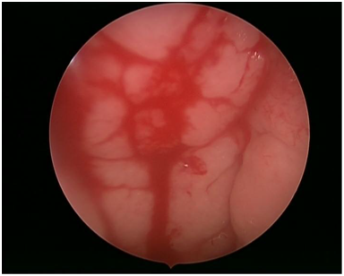 After admission and evaluation in a pediatric center & ruled out ulcer, maillary weises, the patient was referred to our ENT clinic for more evaluation. Full HEENT examination revealed normal. The main complaint was hematemesis. Detailed history revealed complaint of recurrent epistaxis 1-2times per month. Also, she had history of black colored stool but no change in urine. No significant family history of bleeding tendency. Under general anesthesia, nasal endoscopy done showing spontaneous nasopharyngeal bleeding (Figure 1) from the adenoid not controlled with suction cautery, then adenoidectomy done & hemostasis done by packing with xylomethazolin & observation for 7minutes then pack removed with no further bleeding. Patient extubated & shifted to the ICU 1 day for observation. Post operative, the patient became symptom-free and had no more complaint of bleeding or any other complication during our 12months follow up. Pathology of nasopharyngeal mass was reported to be non specific chronic inflammation .We believe that adenoid tissue was the source of the bleeding.