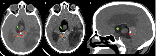 Figure 1 Non-enhanced cerebral CT scan (a), shows a mixed heterogeneous mass extending from the pineal region anteriorly into the cistern of the velum interpositum. The mass contains a central calcification with tissue component (enhancement) on both the axial (b) and the coronal (C) post contrast CT scans.