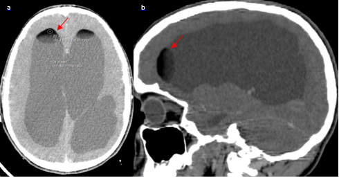 Figure 2 Cerebral CT scan in axial (a) and sagittal reconstruction (b) showing hypodense lesions in the lateral ventricles consistent with fat content forming a supernatant lipid layer floating on the CSF in the superior portions of both lateral ventricles, very suggestive of intra-ventricular rupture..
