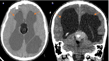 Figure 3 (a) NECT in axial view and postcontrast coronal (view) (B) show hydrocephalus secondary to the obstruction of the aqueduct of Sylvius by the pineal teratoma.