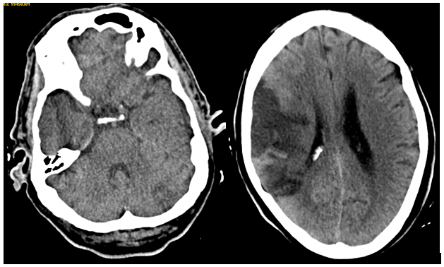 Figure 1 Brain CT scan without contrast, showing right middle cerebral artery stroke and left cerebellar hypodense lesion.