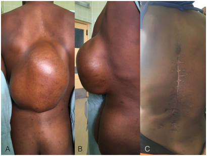 A 25-year-old woman presented in our institution, with a back giant mass, evolved over about two years (Figure 1 A & B). The patient had no pain or other symptoms related to the mass. History of previous diseases was unremarkable, her general condition was good, and she had normal vital parameters. It was not possible to perform a magnetic resonance imaging and we decided to hospitalize the woman for surgery with a diagnosis of possible fibroma. She was HIV negative, and preoperative tests showed normal parameters.