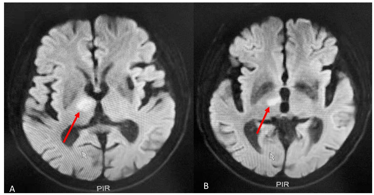 MRI of the brain revealed an infarct in the right thalamus confined to the anterior region (Figure 1 A & B). The hippocampi showed bilateral preserved in volume. EEG was normal. Blood workup showed no abnormalities.