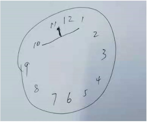 He was unable to identify events and places but was able to recognize family members. The neuropsychological assessment showed MoCA=20/30. On the tests, he was unable to complete the visuospatial/executive performances (his clock drawing test see Figure 2); he failed in the delayed recall, and he was misorientation of time and place as well.