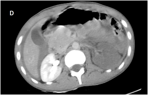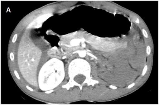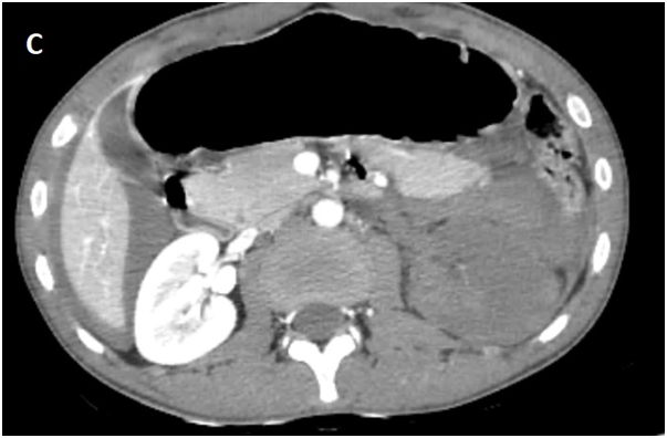 An 18-year-old patient, with no specific history, was admitted to the emergency department for treatment of polytrauma following a traffic accident. 3hours before admission, the patient who was the main driver, was ejected from a moped after being hit by a car. The patient was admitted immediately to the Crash room, with a GCS15 in a state of hemodynamic and respiratory instability, hypotension with 90/60mmHg, no externalized hemorrhage, His initial hemoglobin was at 6g/dL with normal renal function. After enhanced resuscitation measures, the patient was hemodynamically and respiratory stabilized, and the initial founding was; a diffuse abdominal contraction, associated with left lower back pain and macroscopic hematuria.