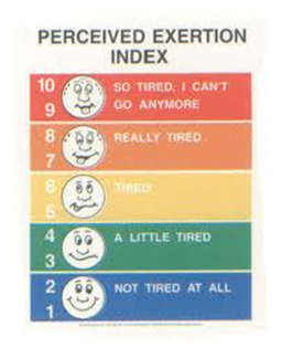 Prior to the first week of the program, exercise diaries were mailed out to the families in order for their child to record exercises they’ve performed throughout the week. The diaries included areas to record the child’s food consumption and exercises performed daily as well as their water intake. To gauge the intensity of each activity, the exercise diaries contained an intensity tracker in order for children to have an easy, understandable way to measure their intensity. The intensity scale is provided in Figure 1 Along with intensity, the duration of time spent on each activity was recorded as well. These diaries served the purpose of allowing the children to set goals for themselves and feel a sense of independence over their own health. This also gave families a means to track their behavior through the 8-weeks and understand their eating and activity patterns. Exercises from the diary were recorded for this study to better understand the child’s total activity in relation to their post-survey scores.
