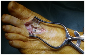 Tourniquet was used for all cases. A dorsal longitudinal incision was made and extensor tendon was laterally retracted. The Meta-Tarso-Phalangeal (MTP) joint as well as the distal metaphysis of the metatarsal bone was exposed. All patients underwent debridement of the MTP joint with removal of loose bodies and synovetomy if needed. A long oblique dorsal wedge osteotomy was performed with an oscillating saw offloading the diseased dorsal cartilage allowing shortening (Figure 1). The metatarsal head was rotated, brining the intact plantar aspect of the articular cartilage into articulation with the proximal phalanx and fixed with a single Barouk headless compression screw (Figure 2). The degenerate articular cartilage was debrided (Figure 3). Microfractures were created using k-wire (Figure 4). The incision was closed with vicryl sutures and 20ml 0.5% Chirocaine was administered as an ankle block. If deemed appropriate, they were offered physiotherapy to optimise mobilisation exercises. All operations were undertaken by one orthopaedic surgeon to eliminate any intra-operative technique variability. Postoperatively patients were mobilized as able in a heel weight bearing shoe for 6weeks. Once radiographic evidence of union was noticed normal shoe wear was gradually resumed. Clinical and radiological assessments were performed at 6 weeks after surgery and periodically at three, six and twelve months and then yearly.
