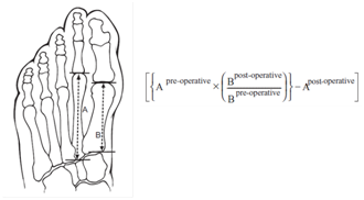 Complications were reviewed from the clinical records. Post-operative metatarsal shortening was evaluated on the dorsoplantar weight-bearing radiographs with a method modified from Jones et al.,13 (Figure 5). The continuous data were expressed as mean and range. Wilcoxon signed rank test and Mann Whitney U test were used for assessing the difference in functional outcome measures. The null hypothesis was rejected if the p value was <0.05.