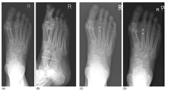 All patient details including clinical and radiological records were reviewed. They were assessed by subjective patient satisfaction scores with regard to the operation. Pre- and post-operative pain scores were recorded based on visual Analogue Scale (VAS) on a scale of 0 to 10. American Orthopaedics Foot and Ankle Society (AOFAS) scores a standardized method of scoring for the lesser metatarsophalangeal joint was used to assess the functional outcome. This scoring system slots in numerical scales to assess function, alignment and pain. They were scored according to their severity of pain, limitation of daily and recreational activities, ability to wear fashionable footwear, restriction of movement and alignment of their toes.