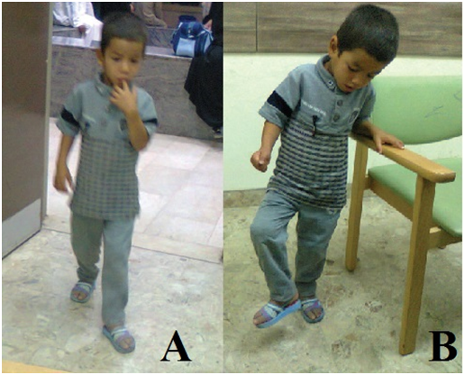However, the boy was unable to stand on one foot without holding the furniture (Figure-1B), A normal child can stand on one foot momentarily at three years. Serum creatine phosphokinase was not significantly elevated.