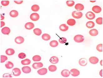 While anaplasmosis and Lyme disease are bacterial infections, babesiosis is a hemolytic disease caused by an intraerythrocytic protozoan parasite. All three diseases are tick-borne, are carried by the same vector (black-legged ticks/Ixodesscapularis), and are endemic to the northeastern part of the United States. It is not uncommon for patients to suffer co-infections from some combination of all three diseases.13–15 Symptoms of babesiosis are nonspecific and may include but are not limited to fever, chills, diaphoresis, weakness, fatigue, anorexia, and headache.16 A peripheral smear can show a pathognomonic intraerythrocytic protozoan parasite with a “Maltese cross” appearance (Figure 3).17 The current treatment guidelines by the CDC recommend a 7 to 10-day course of atovaquone plus azithromycin or clindamycin.18 Our patient was initially started on atovaquone and azithromycin but this was discontinued once repeat serology returned negative for babesiosis and no intraerythrocytic protozoan parasites were noted on peripheral smear. He was considered to have self-cleared his previous babesiosis infection. He was found to be positive for Anaplasmosis.