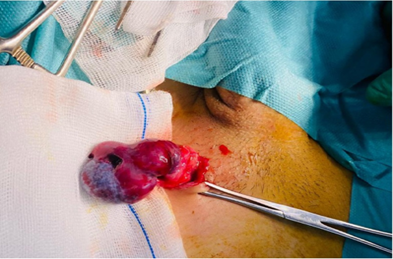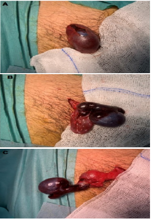 In view of these 2 suggestive clinical cases and after having eliminated a strangulated inguinal hernia, the patients were taken to the operating room without delay. The surgical exploration found a necrotic testis without any stigma of vitality (Figure 2, 3). The orchiectomy associated with the orchidopexy of the contralateral testis, were performed at the same time. The postoperative course was simple.