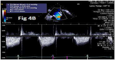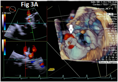Figure 1 Para-valvular leak shown by color Doppler (1A) on 2D and 3D (1B) images, along with dense tricuspid spectral Doppler signal with peak velocity of