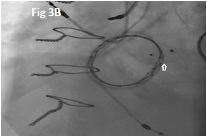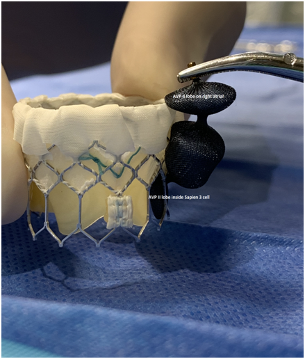 A 73-year-old female with mechanical mitral valve, tricuspid annuloplasty (32mm Edwards Physio Tricuspid incomplete ring) underwent Transcatheter Tricuspid Valve Replacement (TTVR) using off-label 29mm Edwards Sapien 3 (S3) Transcatheter Heart Valve (THV). Immediate post valve deployment, mild Perivalvular Leak (PVL) was noticed at the septal aspect (area of incomplete annuloplasty ring). Eighteen months later, patient presented with recurrent right heart failure and paracentesis due to severe tricuspid PVL (Figure 1A-C, Video 1). Percutaneous PVL closure under general anesthesia, Trans-esophageal Echocardiography (TEE) was performed. Via femoral venous access, defect was easily crossed with Agilis steerable sheath, multipurpose catheter and 0.035” glide wire. Despite recurrent attempts, wire came through the PVL but then traversed through open cells of S3 into the right ventricle (Figure 2A), confirmed with Armada 6mm balloon waist at the S3 cage (Figure 2B) (despite inflating 28mm Z med balloon inside S3 cage, Figure 2C). We decided to partially deploy the plug and assess valve function. Using 7.5F Asahi Eaucath multipurpose guide, a 12mm AmplatzerTM Vascular plug II (AVP II) was advanced through the defect. The ventricular disc was opened inside the S3 cage while body in the PVL defect (outside the S3 cage) and atrial disc on the atrial side of PVL (Figure 3A-B). With S3 function unaffected, no central leak and minimal gradient, PVL reduced to mild severity (Figure 4A-D, Video 2); the AVP II was successfully deployed (Figure 5). At 3-month follow up, there was an excellent symptomatic improvement (NYHA functional class I), with no heart failure re-hospitalization or paracentesis. Deployment of plug disc inside the valve frame is not recommended due to fear of interference with leaflet function and possible injury in long term. There was no immediate issue with the valve function in this case (due to space between the leaflet and frame of S3 and depends on size of plug used). Valve-in-Valve (S3-in-S3) would have certainly sealed all open cells treating this PVL but is more expensive option.