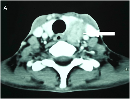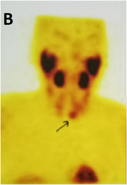 A 30-year-old female presented to the emergency department with severe epigastric pain and persistent vomiting for two days. Physical examination revealed tenderness and guarding in the epigastric area. Bowel sounds were sluggish. Laboratory investigations revealed raised serum amylase (910U/l, reference range 28–100U/l) and serum lipase (286U/l, reference range <67U/l) levels. Computed tomography of the abdomen revealed bulky pancreas with peripancreatic fat stranding, thus confirming acute pancreatitis. Further biochemical investigations revealed high serum calcium (3.5mmol/L) with low serum phosphate (0.56mmol/L). Serum parathyroid hormone levels were markedly elevated (638ng/L) with normal 25 (OH) vitamin D levels (84nmol/L). Computed tomography of the neck revealed 5x3 cm heterogeneously enhancing soft tissue lesion in the left retrotracheal space displacing the left lobe of thyroid gland anteriorly (Figure 1A). Technetium (Tc-99m) labeled sestamibi scan revealed the presence of hot focus in the left inferior pole of thyroid in the delayed image, consistent with parathyroid adenoma (Figure 1B). The patient received fluid replacement with saline and bisphosphonates. After therapy, the serum calcium levels decreased, and the acute pancreatitis subsided. Patient underwent surgical excision of adenoma, and histopathology confirmed the diagnosis.