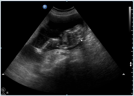 Figure 2,3 Trans-abdominal USG shows an abnormal fetus with grossly formed lower torso and lower limbs without any discernible visceral organs and an echogenic structure casting a distal acoustic shadow, probably representing the spine of the abnormal fetus (white arrow).