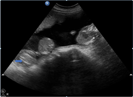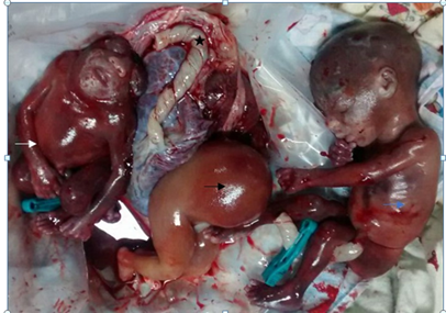 Figure 7 Post-delivery image of exencephaly fetus (white arrow), abnormal a cardiac mass (black arrow) and normal pumping fetus from left to right (blue arrow). All three umbilical cords are separately visualized (star).