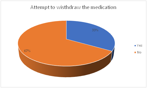 Attempt to withdraw the medication was tried in third of the case (p=0.003). And these trials were failed because of different reasons like relapses or family or patient refusal, as in Figure 5, Table 7. Side effects of medications were poorly documented Table 8.