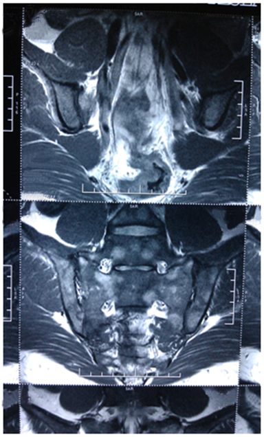 Figure 1 MRI of the Sacro-iliac joint revealed diffuse patchy marrow edema in the bilateral sacro-iliac joints.