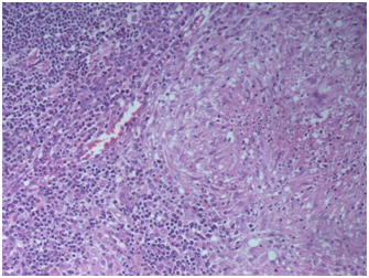 CECT chest and abdomen revealed nodular infiltrates with fibrotic bands in apical segment of right upper lobe with few rim enhancing necrotic lymph nodes at pre-tracheal, right para-tracheal, pre carinal and sub carinal region. Bone marrow examination was done which was normal. Lymph node biopsy of pre-tracheal nodes was done which showed caseous necrosis and langhans type giant cells (Figure 3).