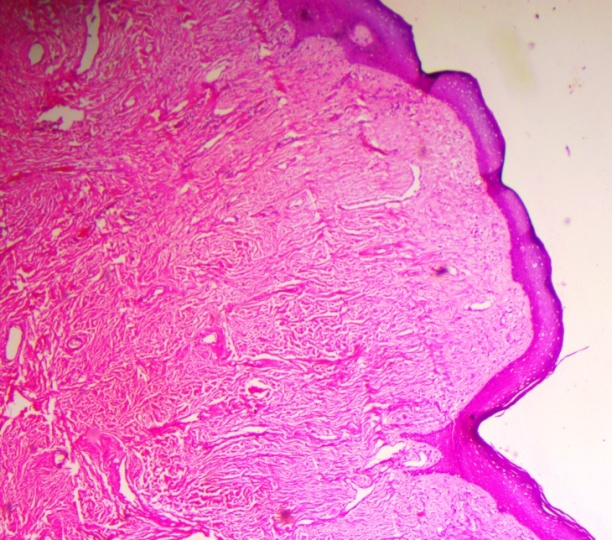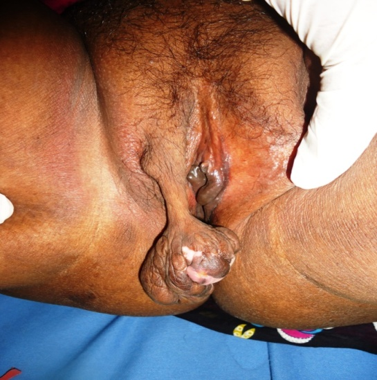 A 38 year old female patient presented to our Skin OPD with a swelling in the genitalia in the last 3 years. It was slowly growing throughout and increased in size from the last 6 months. There was no history of pain, discharge from lesion, vulval discharge, bleeding, ulceration, sexual difficulty, constitutional symptoms, except for a feeling of something hanging while standing and walking. She had regular menstrual cycles.