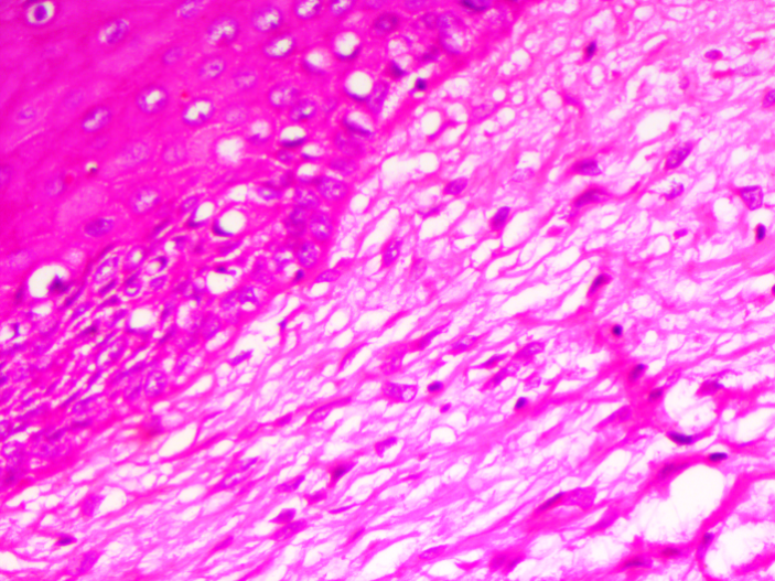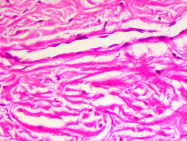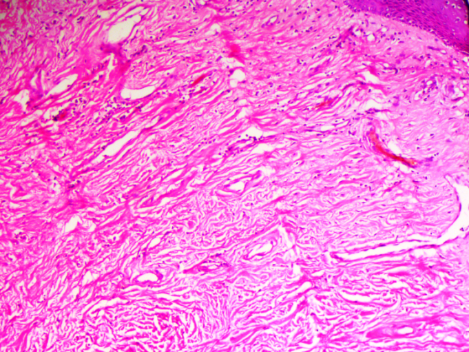 The tumour was surgically removed and sent for histopathological examination. On Histopathology, epidermal atrophy was seen. Dermis showed numerous thick-walled blood vessels in the background of myxoid stroma admixed with stellate and spindle shaped fibroblasts. Based on these features, we came to a diagnosis of Aggressive Angiomyxoma.