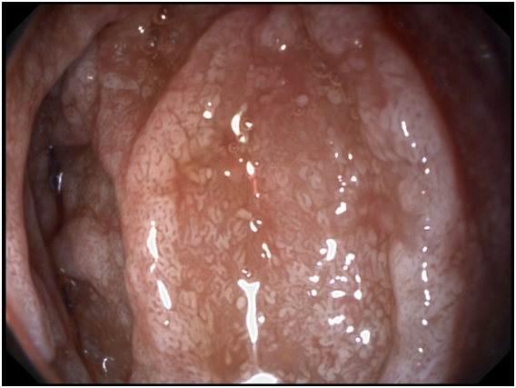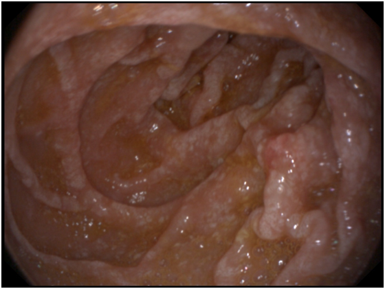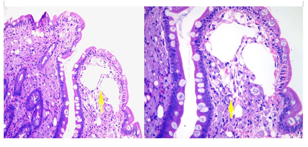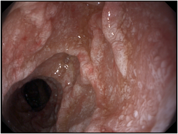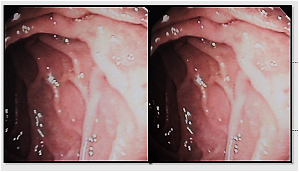 A 53- years old male presenting with chronic diarrhea of 8months duration, his diarrhea was of large volume, frothy in nature with foul odour. It was not related to a specific type of food, persisted during fasting with no diurnal variations. His condition was also associated with significant weight loss. The condition was associated with low grade fever and arthralgia of his both knee and hip joints. After 2months from the onset of his diarrhea he started to develop dizziness and easy fatigability. Physical examination of the patient was unremarkable apart from the pallor. Work up for diagnosing the cause of his diarrhea was done in the form of repeated stool analysis and culture, complete blood count, liver profile, renal profile, electrolytes, ESR, B2 microglobulins, virology (HIV, HBsAg, antiHCVab) and thyroid profile. All the previously mentioned investigations were normal apart from microcytic hypochromic anemia due to iron deficiency with haemoglobin=7.3mg/dl, serum Fe was 10mg/dl and transferrin saturation was 5%, also he had mild hypoproteinemia with serum total protein of 6.2g/dl and mild hypoalbuminemia with serum albumin of 3g/dl. His ESR was 123 and C-reactive protein (CRP) was 49mg/dl as shown in Table 1. Abdominal ultrasound was completely normal. Attempts of giving empirical medications in the form of metronidazole and quinolones failed to control the condition of the patient. Endoscopic intervention was decided in the form of upper endoscopy and colonoscopy. Total colonoscopy and terminal ileoscopy were done with no abnormality detected. For the upper endoscopy; the duodenal mucosa down to the proximal jejunum was markedly congested with extensive whitish mucosal patches as shown in Figure 1-3. Multiple biopsies were taken; histopathological examination showed focal villous distortion and focal villous erosions. The lamina propria showed mild mono-nuclear cell infiltrate with extensive infiltrate of foamy macrophages with dilated lymphatic spaces as shown in Figure 4. PAS (periodic acid shiff) stain was applied during microscopic examination where the organism was detected as shown in Figure 5. And hence the patient was diagnosed as a case of Whipple’s disease (WD). Then treatment was started accordingly in the form of ceftriaxone for 15days followed by trimethoprim-sulfamethoxazole (TMP/SMX) twice a day for 1 to 2years with marked improvement of the patient's condition. The improvement was evident by his laboratory parameters (Table 1) and endoscopic picture (Figure 6).