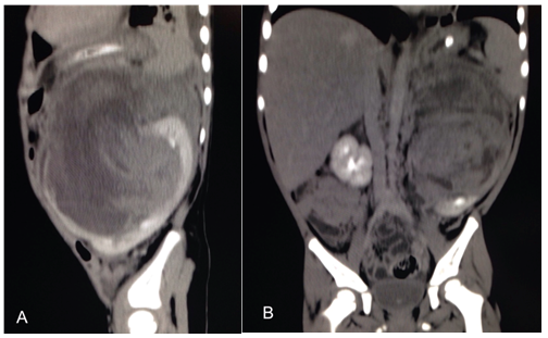 Nephroblastoma or Wilms tumor (WT) represents 90% of renal tumors in children and treatment is a surgical emergency so it is responsible for 5% of pediatric malignant tumors.6 WT is usually asymptomatic until a solid abdominal mass is detected. It has been shown that the use of preoperative chemotherapy and radiotherapy for large tumors and other structures decreases recurrence. In case of spontaneous tumor rupture, there is staging change from I to III, with tumor cells embolization and local extension.7