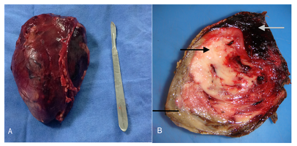 We report the case of a 3-year-old female, with no past medical history. She was admitted to the emergency room after one week left flank pain associated with nausea and vomiting for the last 24hours. Her mother reports that a week before she tripped hitting the floor in the left upper quadrant, with minimal pain in this area until the last 24hours. Physical examination did not evidence hematoma or skin excoriations; we found abdominal bloating, lack of peristalsis and severe pain on palpation in the left flank. Laboratory tests were performed reporting no microscopic hematuria, creatinine 0.8mg/dl, hemoglobin 6mg/dL and hematocrit of 19%. Abdominal computed tomography: left renal hematoma that does not allow the display of spleen, with lower extension and displacement of bowel loops, with no involvement of renal hilum (Figure 1A). Within the hematoma, a 12.8x9x7cm solid lesion with heterogeneous areas located up to 68 UH was identified (Figure 1B). The patient was hemodynamically stable but with persistence of pain and intestinal obstruction secondary to hematoma compression. Clinical presentation with signs and symptoms not according to trauma mechanism and CT scan reports made us suspect the presence of a tumor in the affected kidney. Therefore abdominal exploration was performed; renal hematoma and grade III kidney injury with rupture tumor were found. Left nephrectomy is decided at that time (Figure 2A).