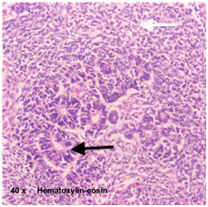 After transfusion of 3 red blood cell packs and 72h of observation patient was sent home. The histopathological report was of a Stage III Wilms tumor with Gerota fascia rupture without nodal or vascular disease (Figure 2B). Blastemal component 60%, epithelial component 40%, necrosis 10% and no evidence of anaplastic were reported (Figure 3). The patient was lost to follow up until four months later when she was asymptomatic and with normal renal function at this moment. She was sent to pediatric oncology but did not attend follow until 9months later when she came back to emergency room due to respiratory distress associated with respiratory tract infection. The CT scan reported pulmonary and abdominal metastasis. The patient received standard chemotherapy treatment in other institution.