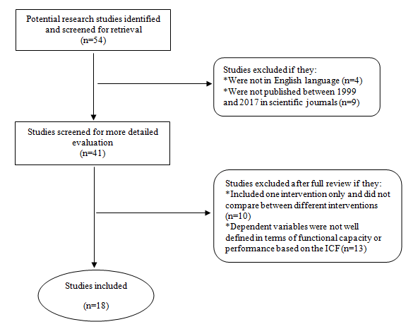 The following electronic databases were searched to identify literature relevant to this study: PubMed, Ovid (MEDLINE, PsychINFO, and Global Health), and Cumulative Index of Nursing and Allied Health Literature (CINAHL). Search terms (keywords) used were occupational therapy combined with function, rehabilitation, healthcare, neurorehabilitation, biomechanics, mental health, geriatrics, and pediatrics. Fifty four potential relevant research studies were identified and screened for the literature review (Figure 1). Research studies were selected and included in the literature review if they were written in the English language and published between 1999 and 2017 in peer-reviewed journals. Based on these criteria, 41 studies out of the 54 were identified and reviewed and 13 studies were excluded. Furthermore, studies were screened again for more detailed evaluation and were included if they involved occupational therapy assessments and interventions, comparisons between occupational therapy interventions and other interventions. In addition, previous studies that addressed functional performance among persons with disabilities from different age groups were also included. Studies were excluded if they included one intervention only and did not compare between different interventions, or because the dependent variables were not well defined in terms of functional capacity or performance based on the International Classification of Functioning, Disability and Health (ICF) (WHO, 2001). This yielded a total of 18 studies that were included in the literature review and 36 studies were excluded.