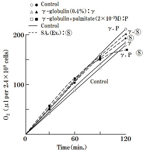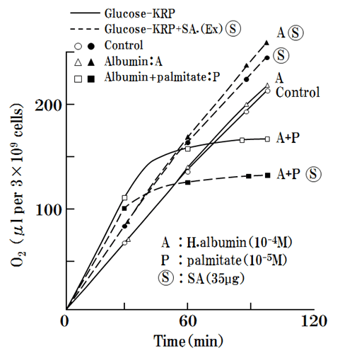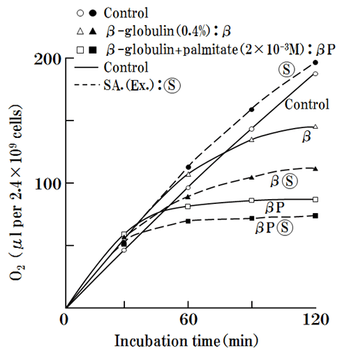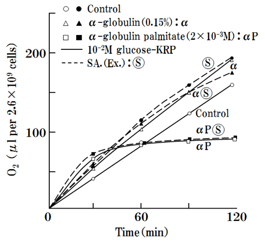 Figure 6 Interaction of SA (Ⓢ) and α-globulin-FFA (αP) in oxygen uptake of Ehrlich ascites tumor cells. α-globulin (0.15%)(α), palmitate( 2x10-3M)(P) and SA(Ⓢ)(35μg) were utilized. SA (.Ex) means which was mixture of SA and mix-juice of apple and cucumber. Ehrlich ascites cell are cultured in the incubator at 37°C. Oxygen respiration was stopped 30 minutes after the addition of 35μg SA.
