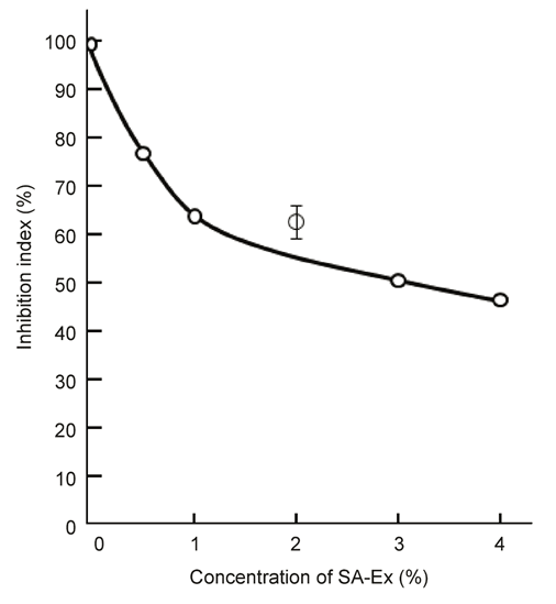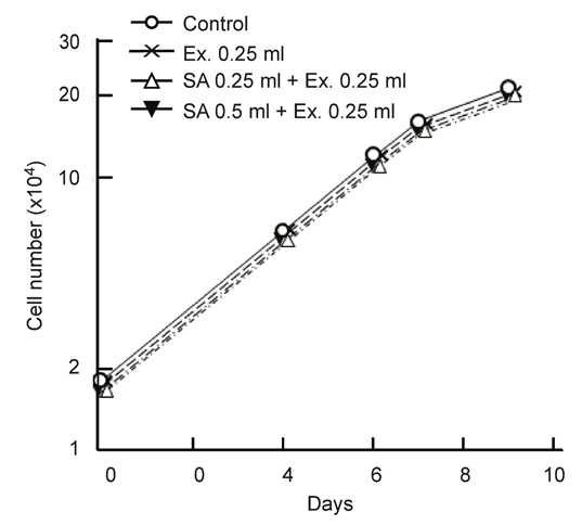 3 x 103cells/ dish, sub-cultured from a SV40 transformed colony in the low Ca 2+ medium, were seeded and treated with SA-Ex which was the combination of SA and apple and cucumber juice (50/50), on day 3. Colonies were counted on day 10. The number of colonies without SA-Ex was 190.