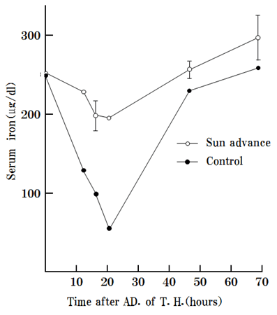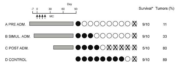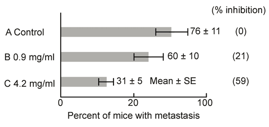 Figure 11 Inhibitory effect of Sun Advance on metastasis. 5x106 of MH134 cells were injected sc in tails of syngeneic C3H mice. Mice were given SA (B: 4.2mg or C: 0.9mg/ml) per os from day 0 after the injection to day 14. The number of mice with metastatic lymph nodes was counted on day 14 by autopsy examination.