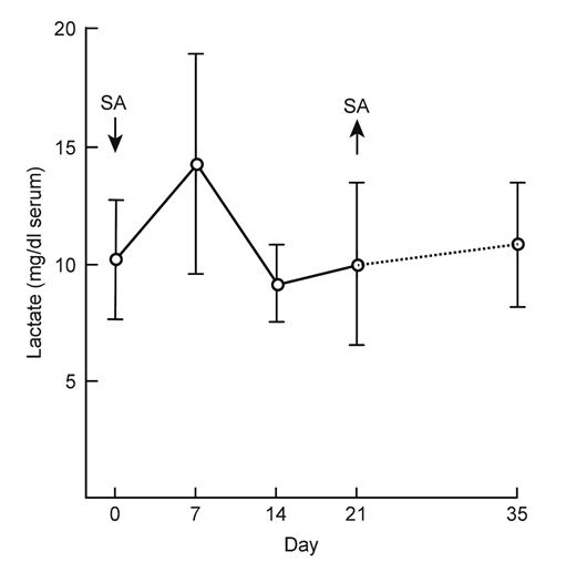 Figure 4 Effect of SA( 35μg)(Ⓢ) and human albumin (10-4 M)(A) + FFA ( palmitate 10-5M)(P) on Ehrlich ascites tumor cells( 109cells). Each sample includes 10 samples tested and data are averaged. Ehrlich ascites cell are cultured in the incubator at 37°C. Oxygen respiration of Ehrlich as cites cancer was stopped 30minutes after the addition of 35μg SA.