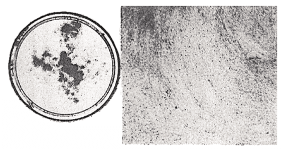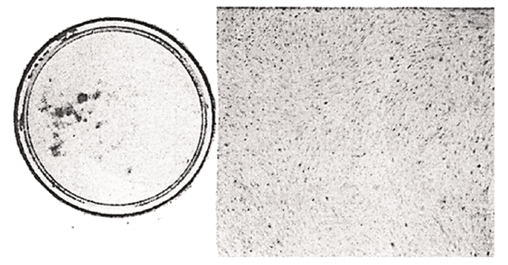 Figure 15 Effect of SA on inhibiting SV40-transformation of mouse cells with SA. C3 H mouse kidney cells (103) were seeded on one plate in the presence of 35μg/ml of SA and infected with SV40 virus (106PFU/0.2ml). Black spot are there, but no transformation observed.
